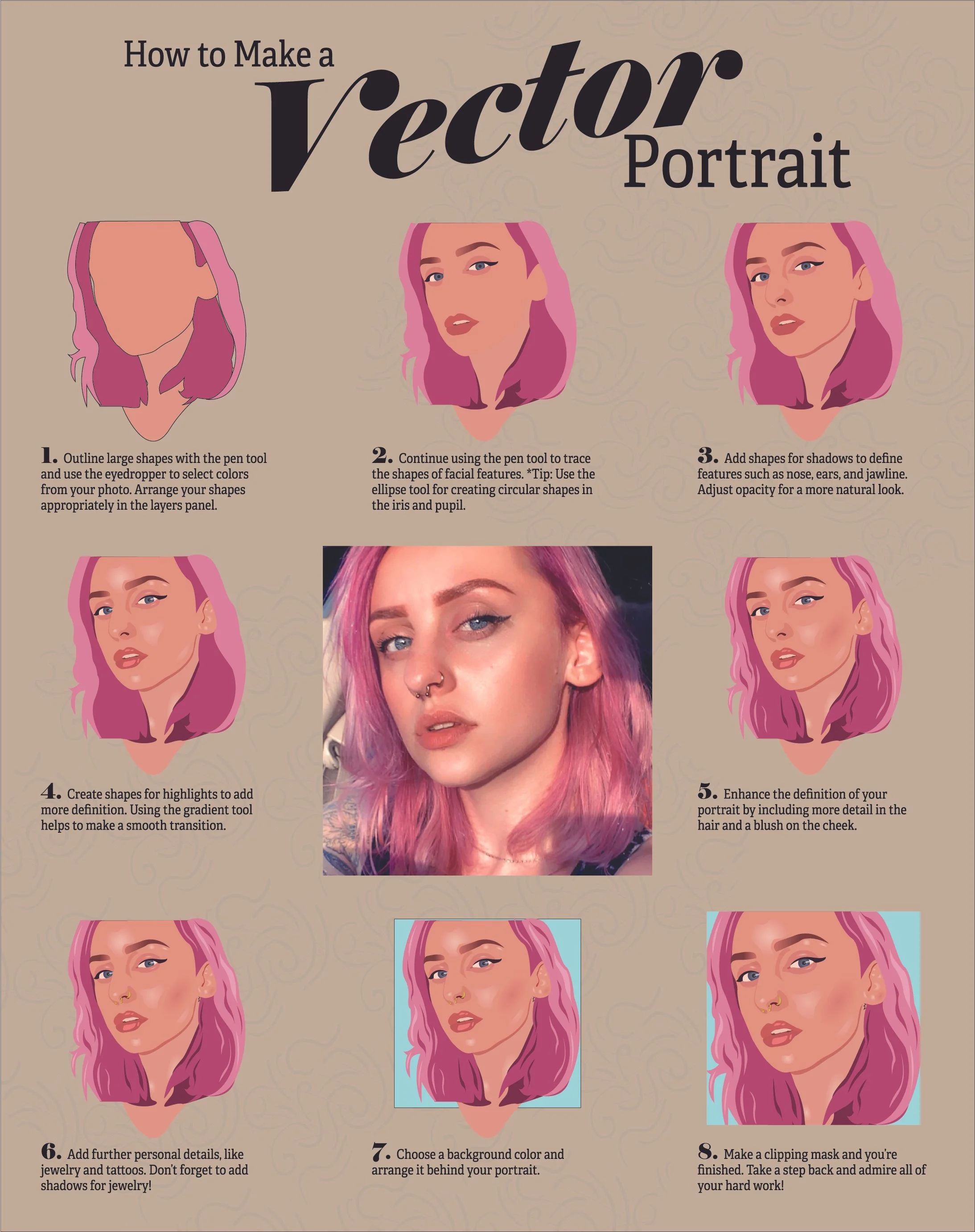 Digital portraits I have completed entirely in Adobe Illustrator and an infographic I created explaining how I create them.